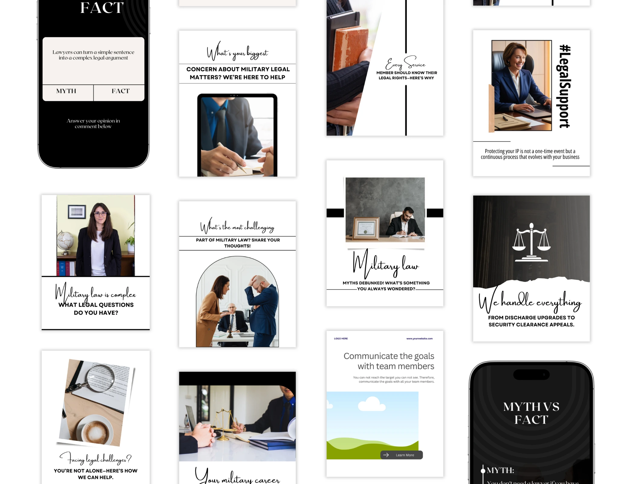 Professional Social Media Kit: Hundreds of Posts & Stories designed for legal educational content, “Myth vs. Fact,” and client testimonials.